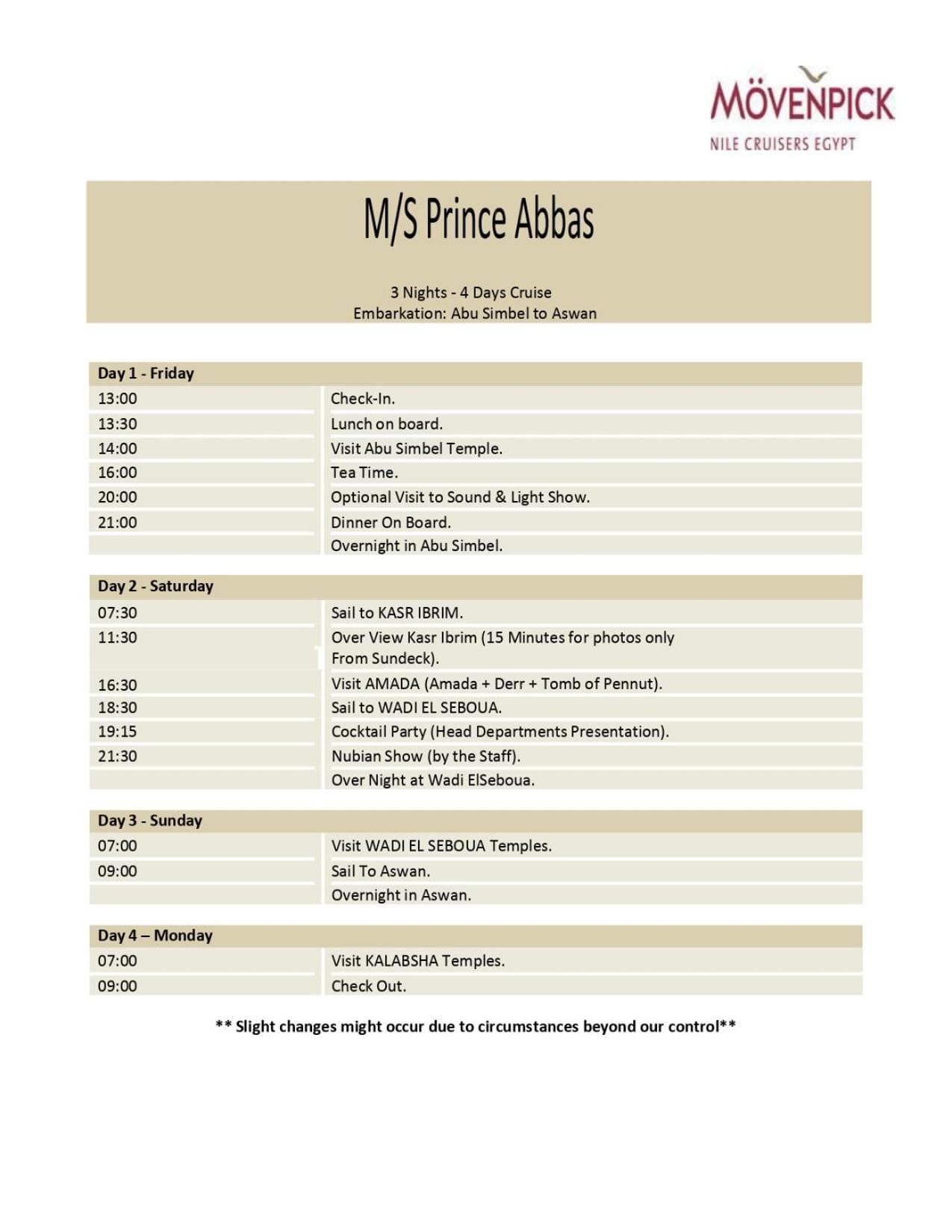 Mövenpick Prince Abbas Lake Nasser Cruise, Monday Four Nights Aswan Friday Three nights Abu-Simbel